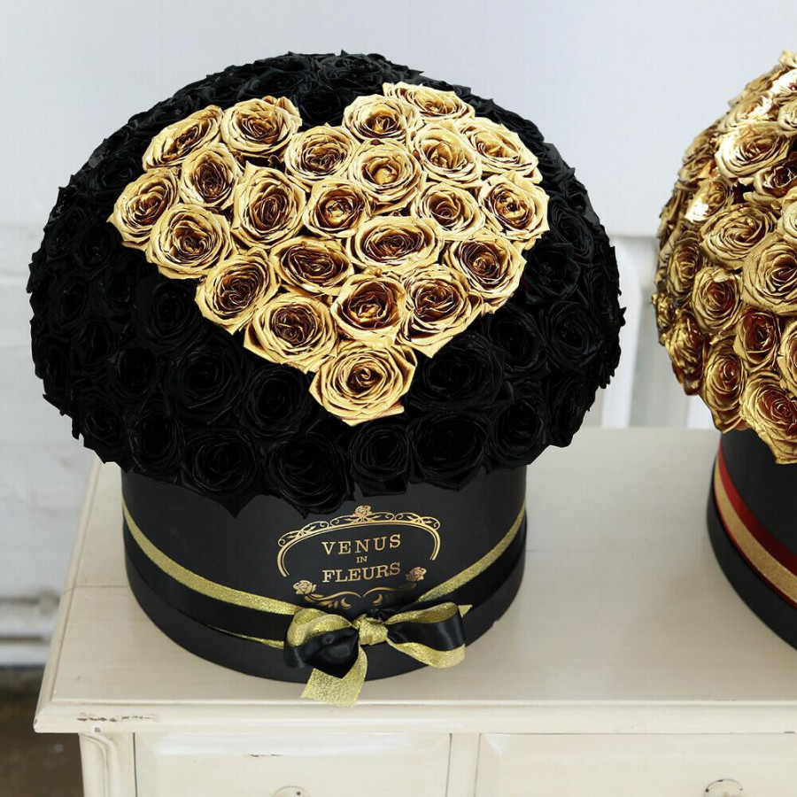 На фото букет из 201 черной и золотой розы в коробке. В составе: роза 201 шт, оазис флористический 4 шт, шляпная коробка (xl) 1 шт, атласная лента 3 шт, . Все цветы свежие и ароматные, букет красиво оформлен и отлично подходит для подарка. Доступна доставка цветов или самовывоз.